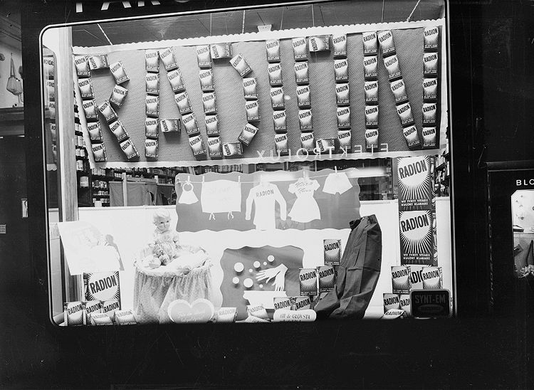 Affärsexteriör, skyltfönster med tvättmedel Radion.
