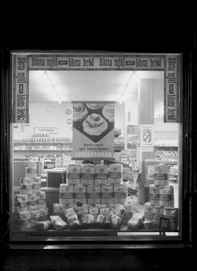 Konsum, skyltfönster med vetemjöl Juvelkronan.