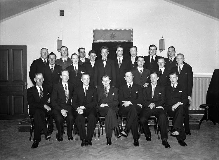Rumsinteriör, gruppbild, kamratmöte, skolklass från Engelbrektsskolan.