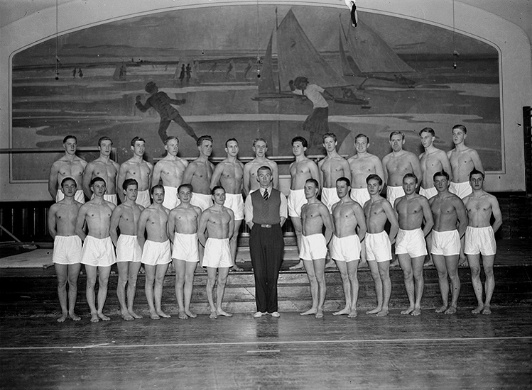 Interiör av gymnastiksal, Arbetarnas Gymnastikförenings manliga avdelning, 26 personer.