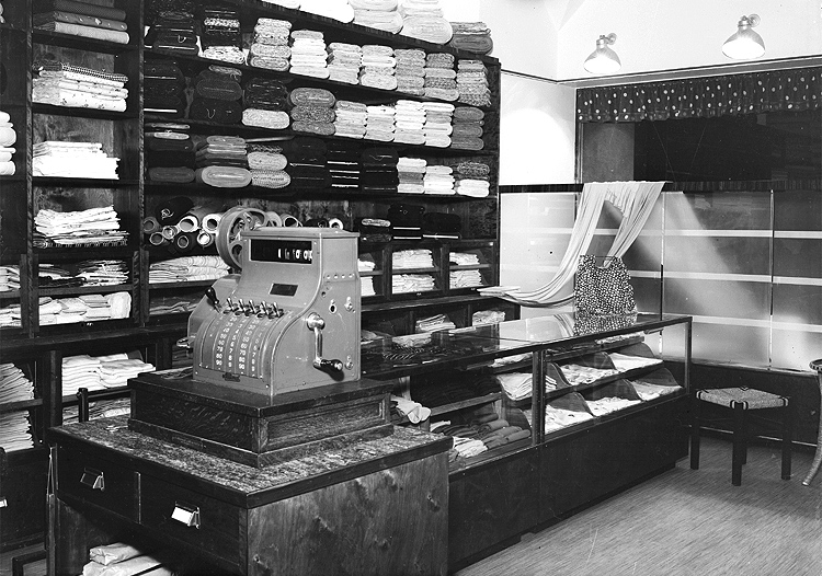 Enhetspris AB, Epa, affärsinteriör, textilier och tyger, kassaapparat.