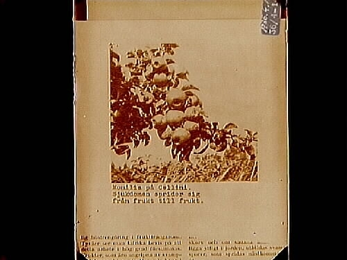 Bärodling, äpplen, Monilia på Cellini, sjukdomen sprider sig från frukt till frukt.