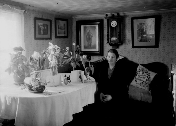 Titel: Rumsinteriör, en kvinna. Fru Ester Hellström på 50 årsdagen.