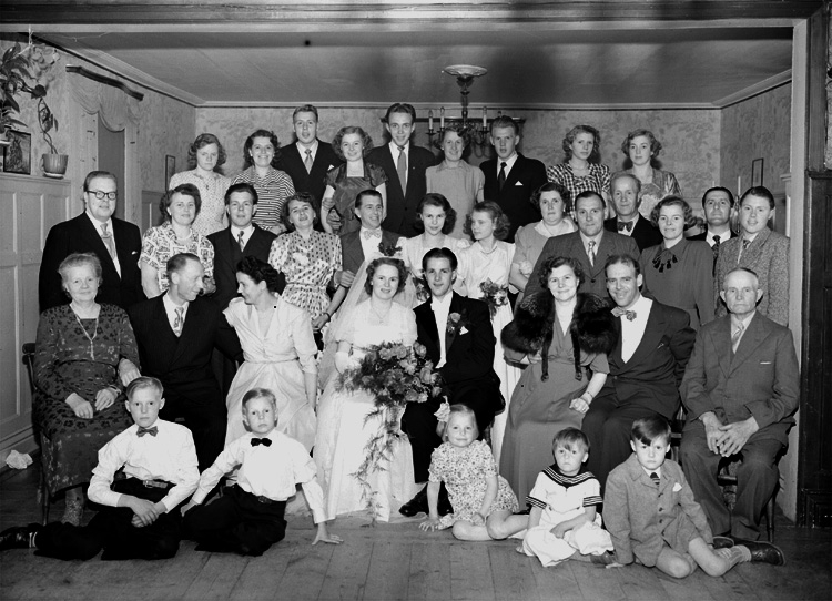 Rumsinteriör, bröllop, brudpar och bröllopsgäster på Sörbygården.