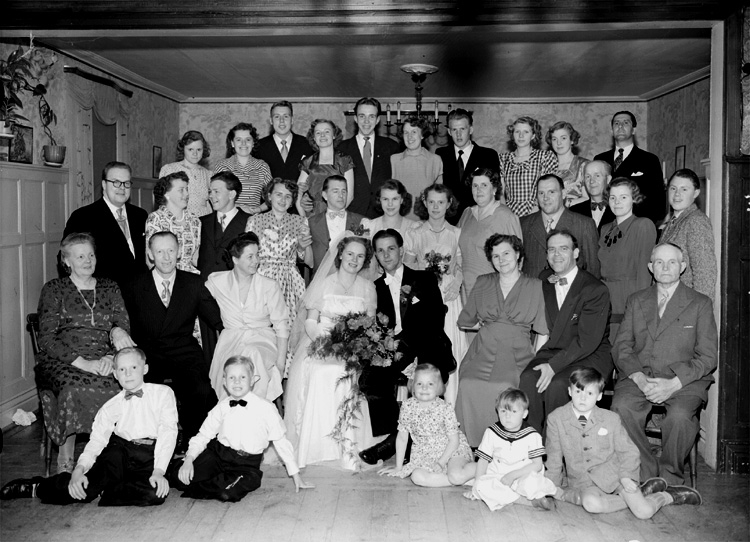 Rumsinteriör, bröllop, brudpar och bröllopsgäster på Sörbygården.