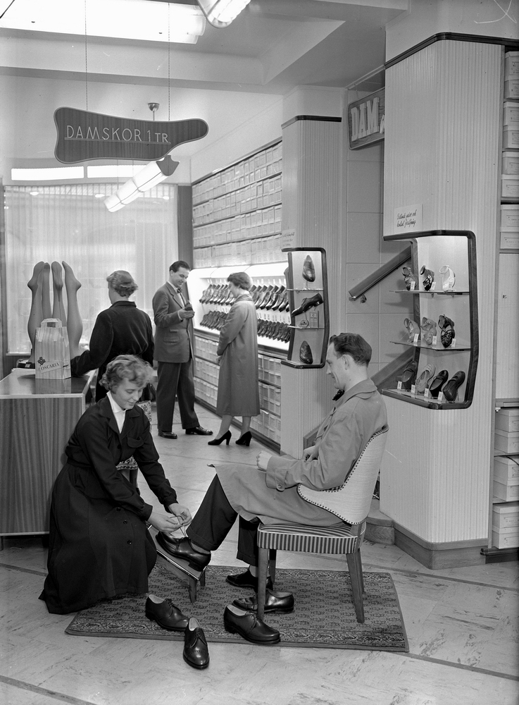 Oscaria City, skoaffärsinteriör, skoprovning, en kvinna hjälper en man att prova skor.