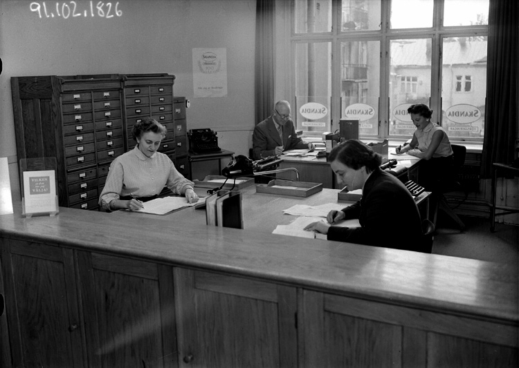 Titel: Skandia försäkringar, kontorsinteriör, fyra personer.
