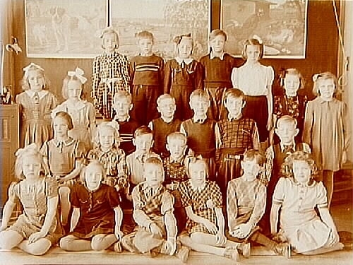 Titel: Engelbrektsskolan, klassrumsinteriör, 13 flickor och 11 pojkar med lärarinna fru Agda Borgell, klass 2, sal 4.