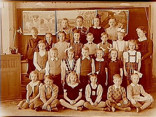 Titel: Engelbrektsskolan, klassrumsinteriör, 13 flickor och 11 pojkar med lärarinna fröken Elsa Lindh, klass 2, sal 16.
