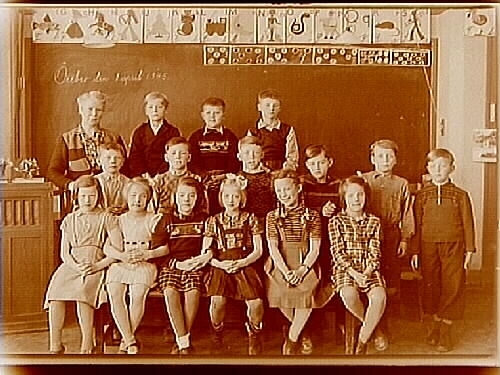 Titel: Engelbrektsskolan, klassrumsinteriör, 6 flickor och 9 pojkar med lärarinna fröken Anna Månsson, klass 2, sal 5.
