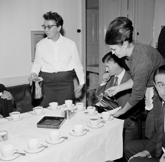 Titel: Rumsinteriör, grupp vid bordet. UB, 30-årsjubileum.