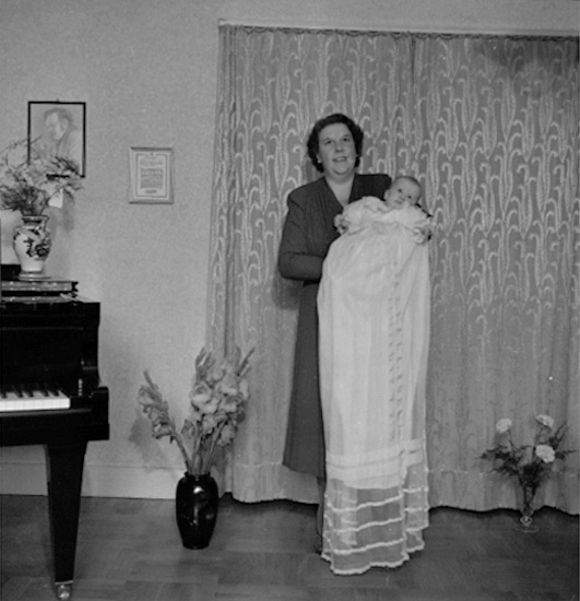 Titel: Rumsinteriör, en kvinna och en baby, barndop. Fru Falk