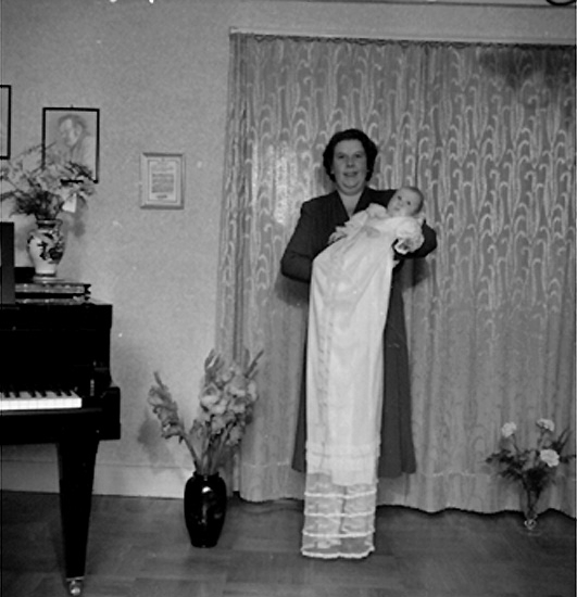 Titel: Rumsinteriör, en kvinna och en baby, barndop. Fru Falk