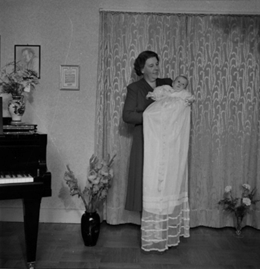 Titel: Rumsinteriör, en kvinna och en baby, barndop. Fru Falk
