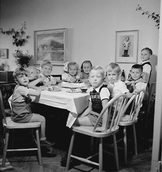 Rumsinteriör, barnkalas, grupp vid bordet.