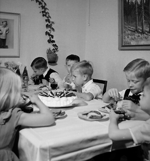 Rumsinteriör, barnkalas, grupp vid bordet.
