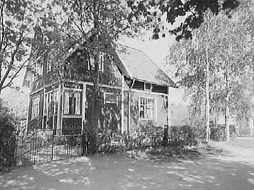 En och en halvvånings villa med frontespis och glasad förstebro.