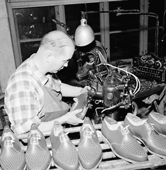 Oscaria Skofabrik, interiör, skotillverkning, en man.