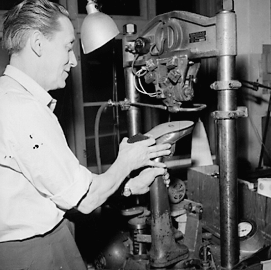 Titel: Oscaria Skofabrik, interiör, skotillverkning, en man. Bilden tagen för broschyr.