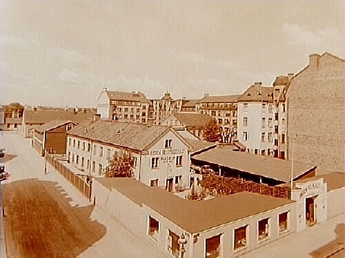 Fyra vånings skofabriker i bakgrunden.
