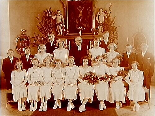 Konfirmander, 13 flickor, 6 pojkar och kyrkoherde Morén.