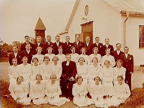 Konfirmander, 22 flickor, 13 pojkar och pastor B. Eriksson.
