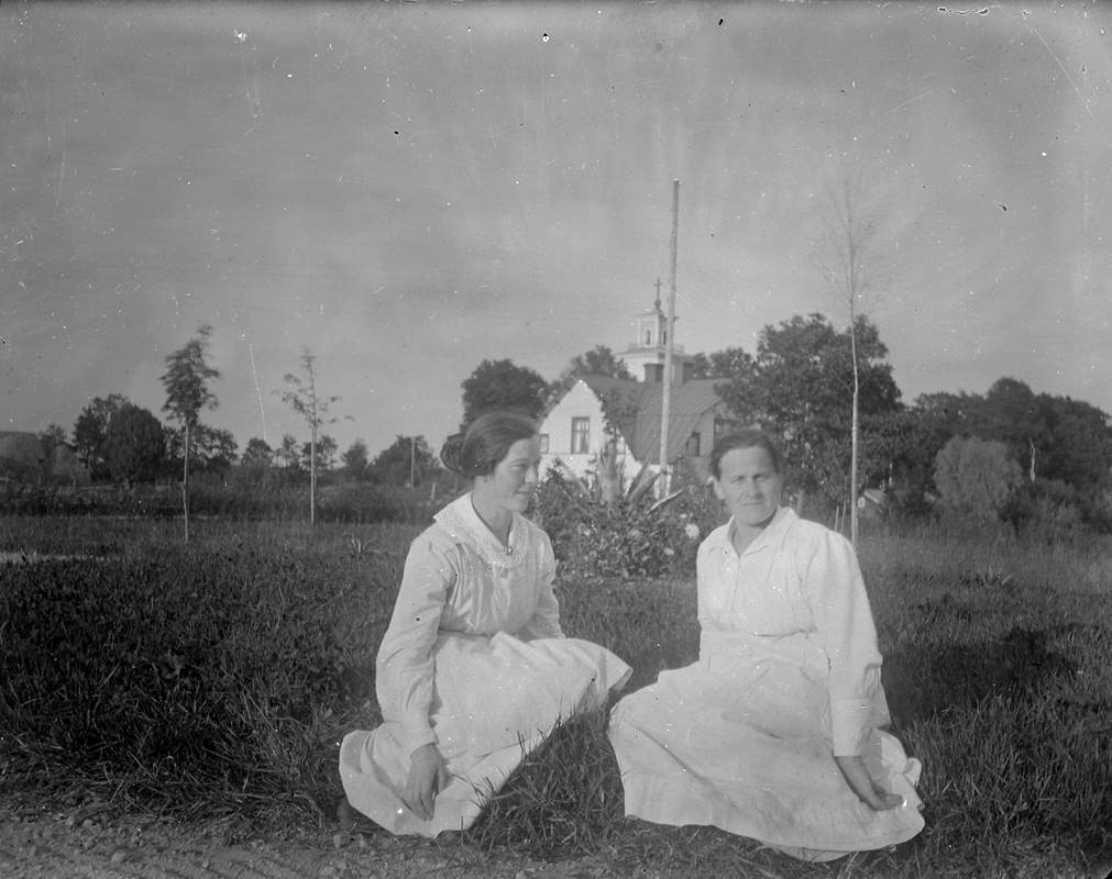 Bostadshus och kyrkobyggnad (kyrktorn) i bakgrunden.