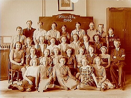 Almby Södra skola, klassrumsinteriör, 19 flickor, 10 pojkar med lärare Albert Johansson, sal 1, klass 8A.