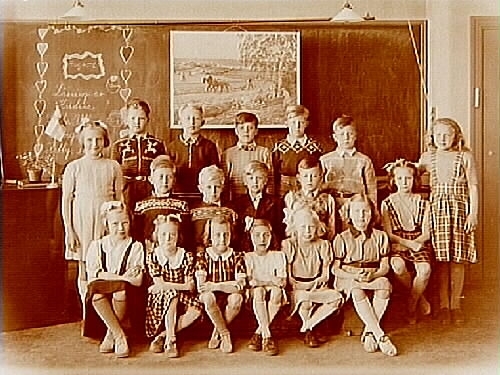 Engelbrektsskolan, klassrumsinteriör, 9 flickor, 9 pojkar med lärarinna fröken Emmy Söderlund, sal 16, klass 2.
