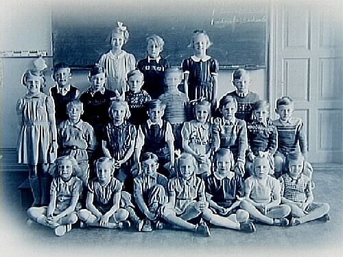 Vasaskolan, klassrumsinteriör, 23 skolbarn med lärarinna fröken Ebba Hansson, sal 7, klass 1.