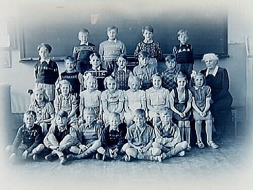 Titel: Vasaskolan, klassrumsinteriör, 24 skolbarn med lärarinna fröken Hildur Johansson, sal 2, klass 2.