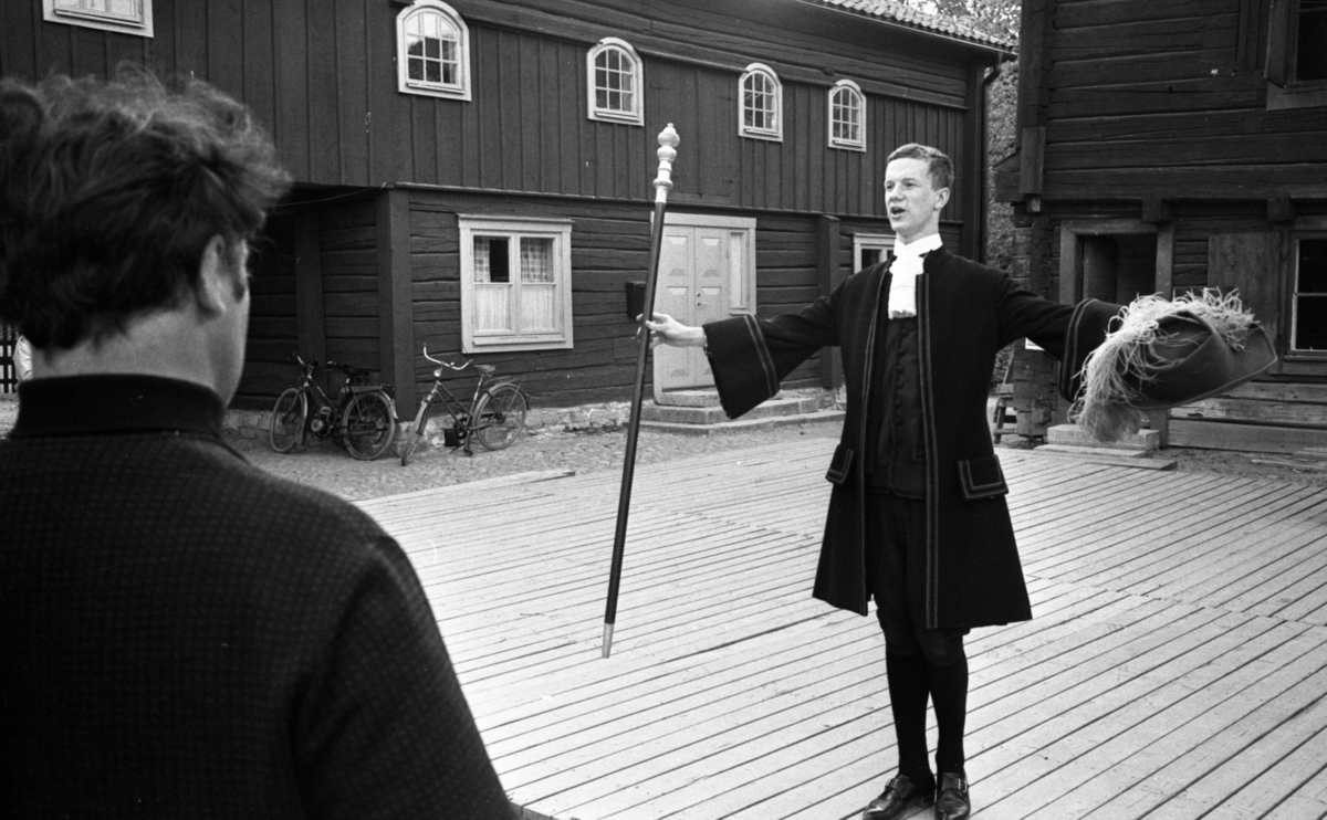 En skådespelare i aktion iklädd i 1700-talskläder. Regissör i förgrunden.