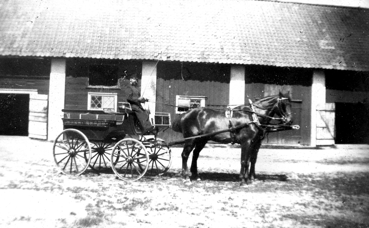 Ekonomibyggnad, häst spänd för vagn, en man.