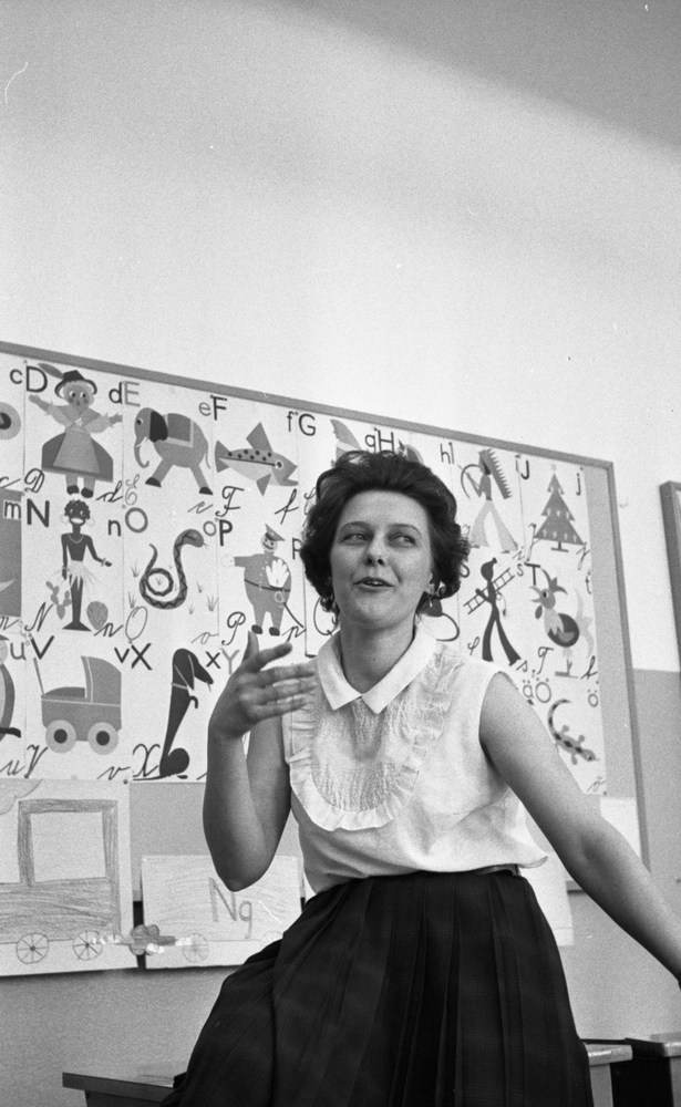 Kopparbergs skola, 1 mars 1967. En lärarinna som sitter i ett klassrum i en skola i Kopparberg. Hon är klädd i en vit blus och en svart veckad kjol. I bakgrunden hänger en anslagstavla med varje bokstav i alfabetet, barnteckningar m.m.