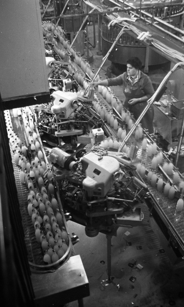 En industriarbetare- en kvinna- klädd i arbetskläder arbetar vid det löpande bandet inne i Kopparbergs bryggeri. Läskedrycksflaskor kommer åkande på bandet.