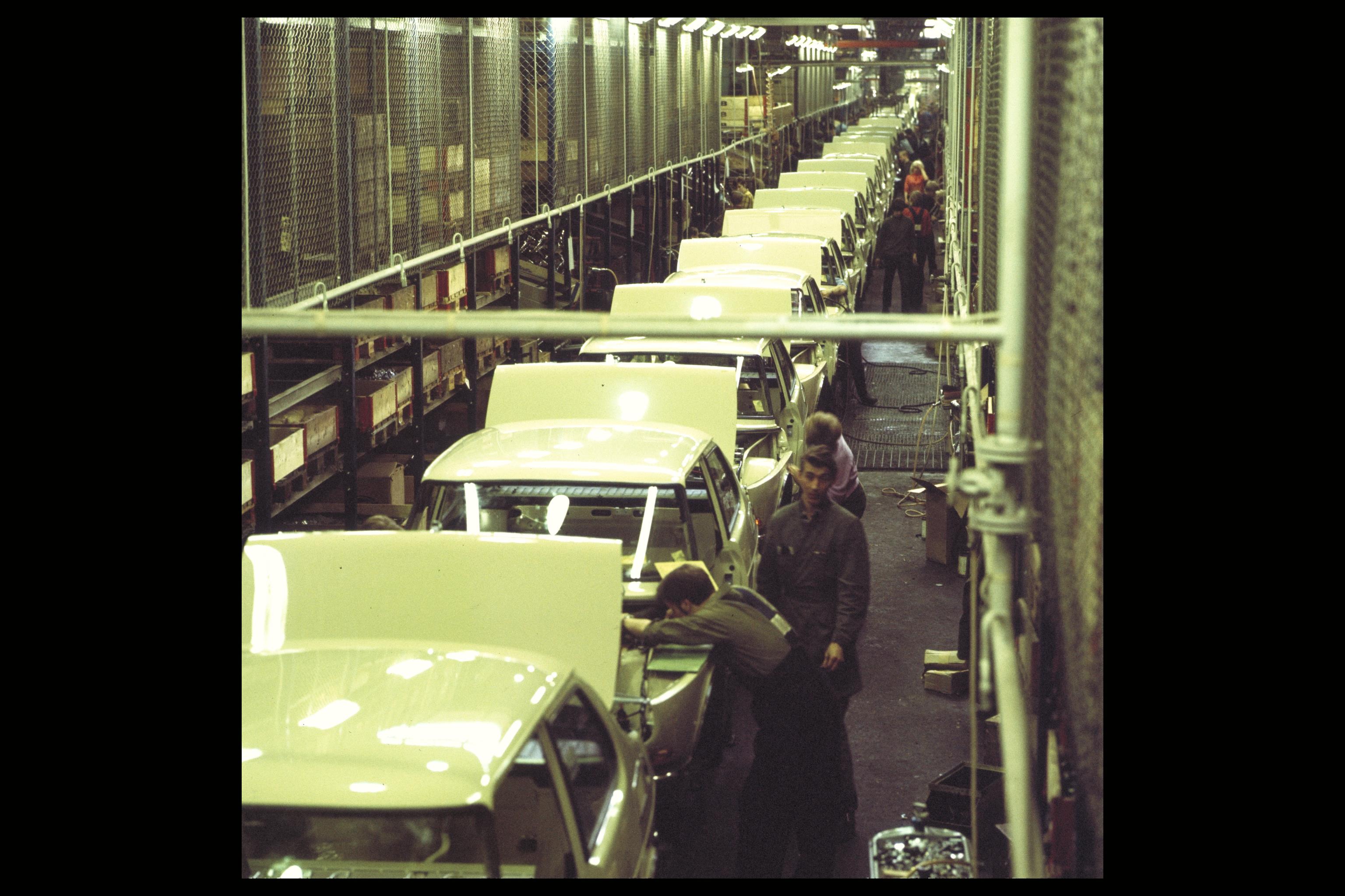 Ett löpandeband av Saabs, då, nya modell; Saab 99. Bilden osäkert daterad, men inte innan hösten 1968, det var då Saab 99 började tillverkas.