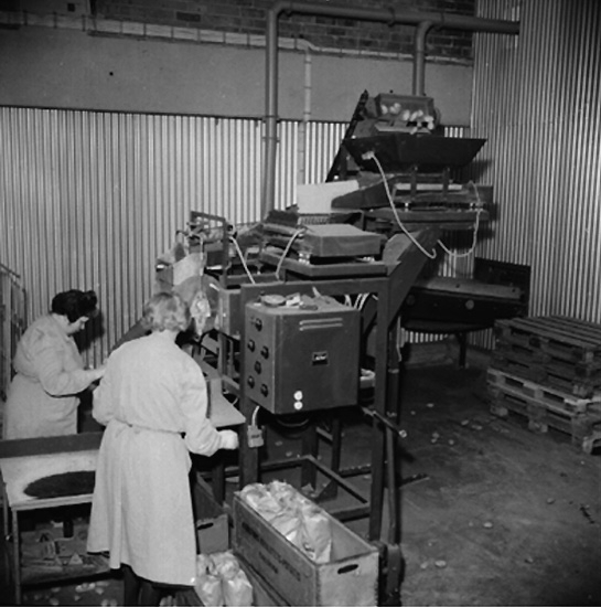 Interiör, förpackning av potatis, två kvinnor.