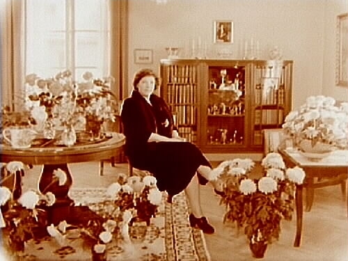 Titel: Rumsinteriör, en dam omgiven av blommor (troligen födelsedag).