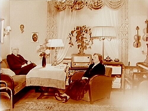 Rumsinteriör, en man och en kvinna, musikinstrument.
