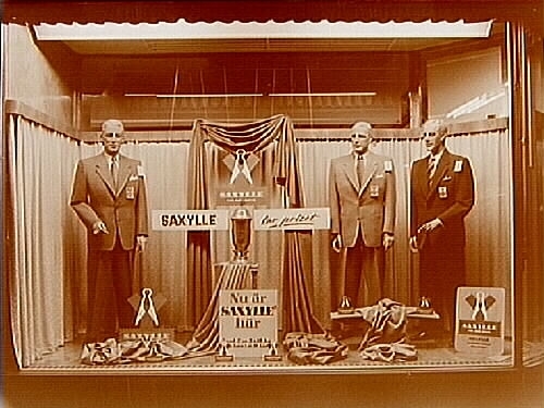 Andersson & Gustafssons skyltfönster, kostymer av saxylle.