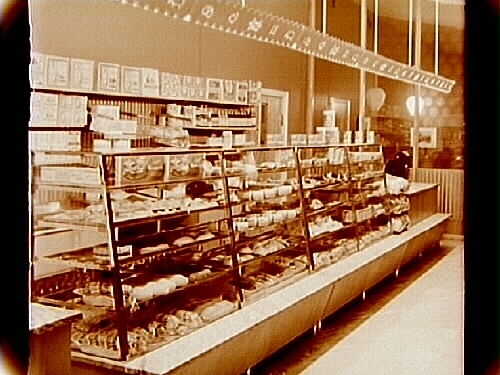 Konsum, affärsinteriör, bröd, kakor m m.