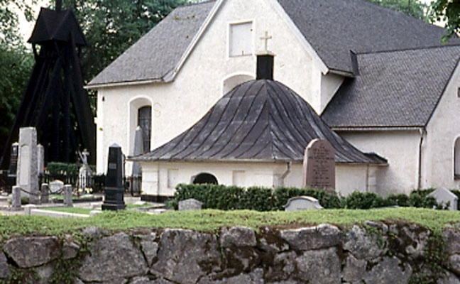 Almby kyrka med kyrkogård och klockstapel.