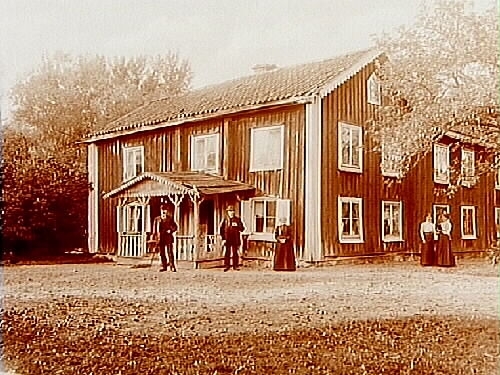 Tvåvånings vinkelbyggt bostadshus med veranda i snickarglädje.
