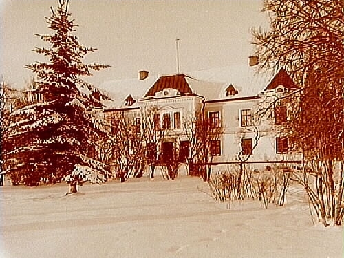 Nynäs säteri, tvåvånings herrgårdsbyggnad med frontespis och tre takhuvar.