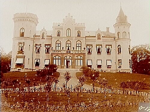 Boo Slott, tvåvånings slottsbyggnad med frontespis med inredd vind, två torn och balkong, byggt i götisk stil, framsidan av slottet.