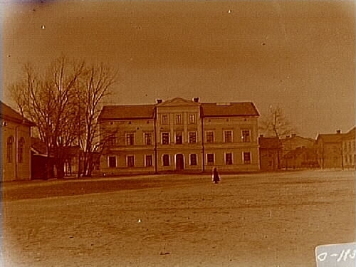 Tvåvånings skolbyggnad med inredd vind och frontespis, Karolinska Läroverkets norra lärohus, kallat "Sibirien", vid Fredsgatan.