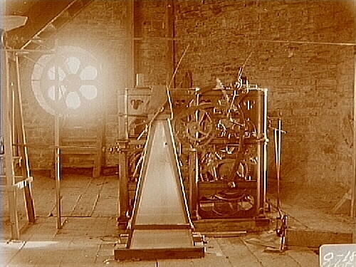 Nikolaikyrkan, interiör av kyrktornet med urverk till klockan, urtavlan.