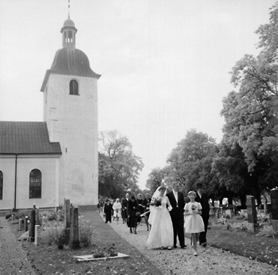 Brudpar och bröllopsgäster, kyrkobyggnad i bakgrunden.