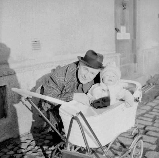 En man och ett barn i barnvagnen.