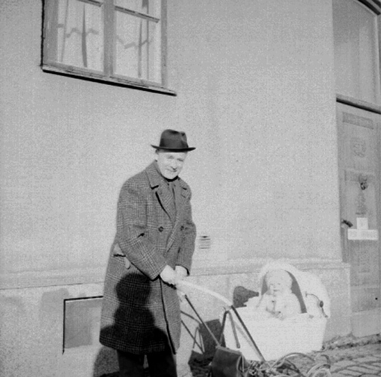 En man och ett barn i barnvagnen.